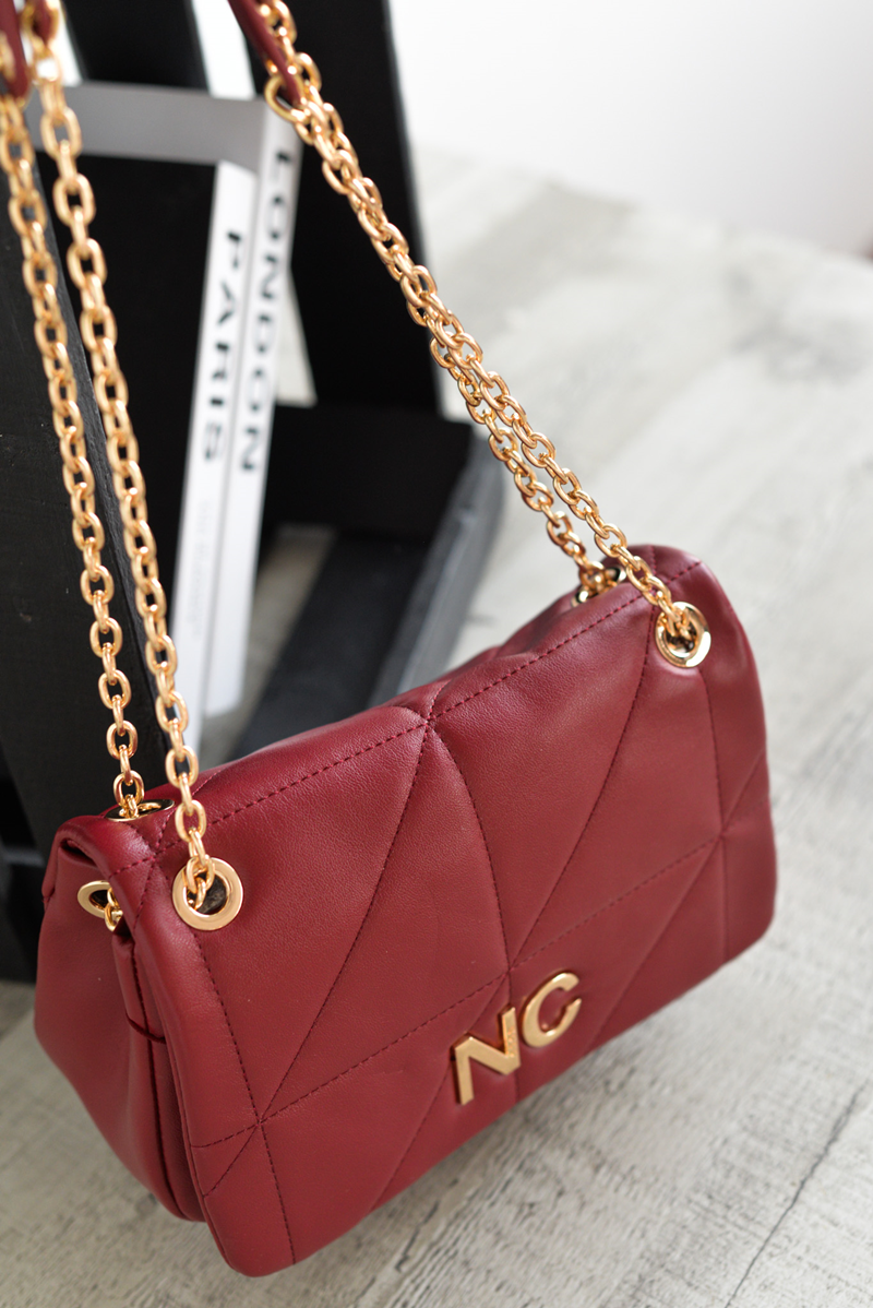 Bandolera mediana con tapa superior y cadena dorada con aplique de piel vegana en el hombro.