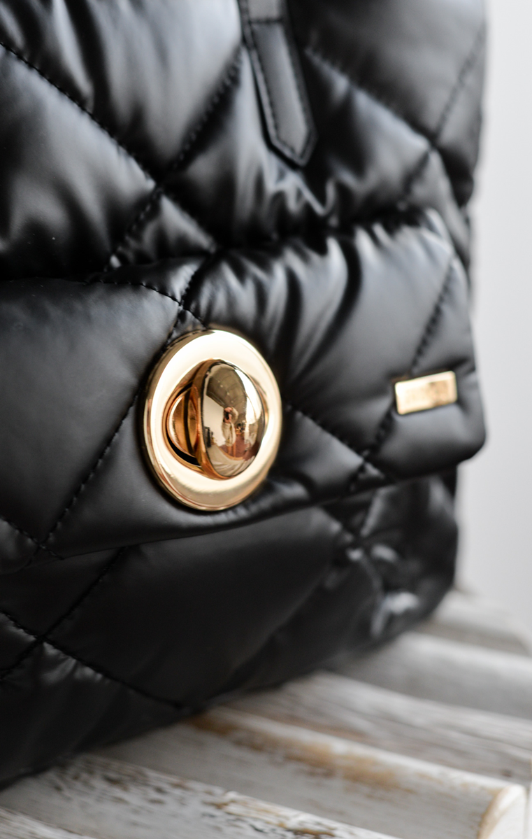 Bolso con material tecnico acolchado tipo plumifero con bolsillo delantero con tapa y cierre dorado llamatico.Con cremallera superior.