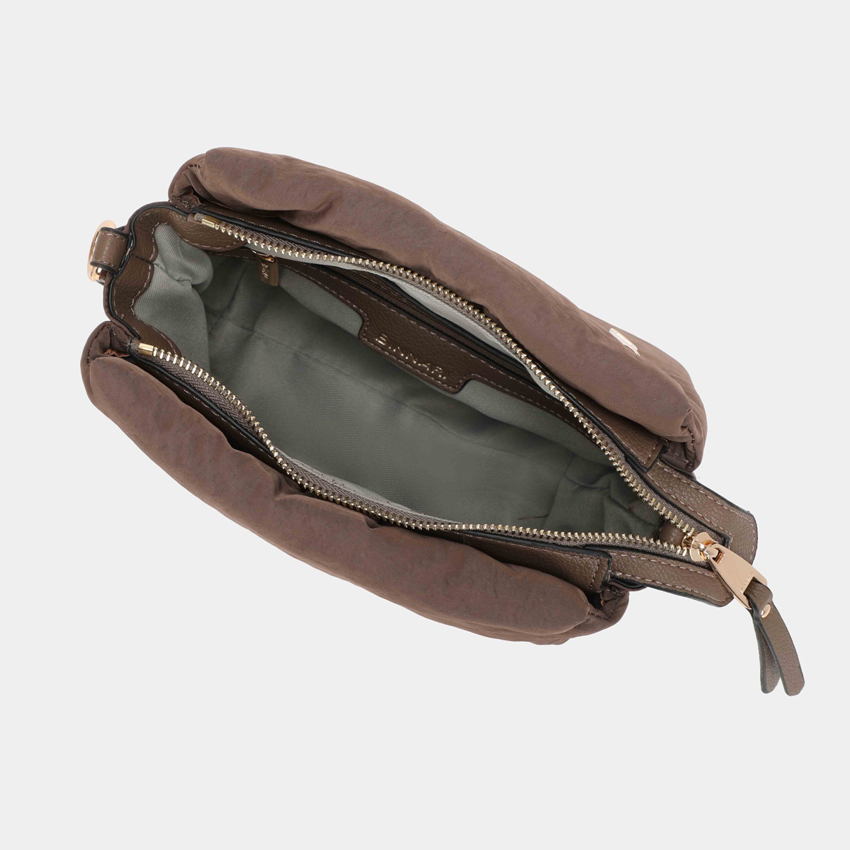 Confeccionado en nylon y detalles en pu, asa trenzada y dos posiciones de hombro o bandolera.Bolsillo interior y exterior con cremallera.