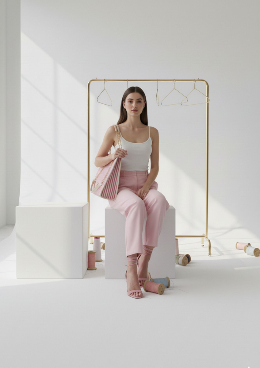 Bolso de lona a rayas con textura relieve.Fondo beige,asas de cadena para llevar de mano y correa larga para usar como bandolera.