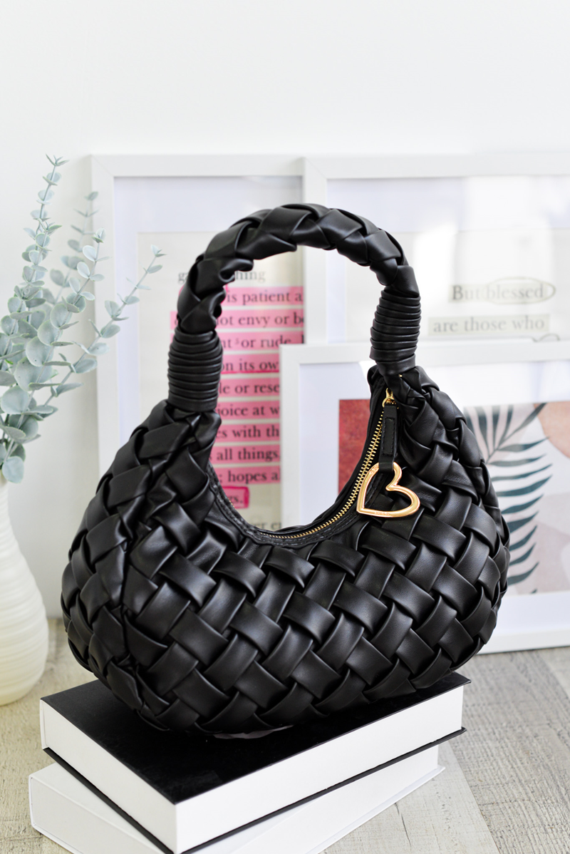 Piel sintetica trenzada con cremallera superior y tirador en forma de corazon.