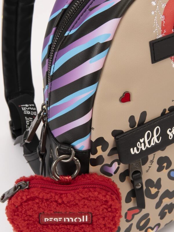 Mochila con bolsillos interiores y exteriores con cremallera.Incluye monedero en forma de corazón